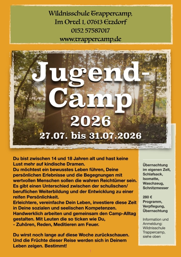 Zweimal im Monat treffen wir uns freitags von 16.00- 19.00 Uhr in einer lockeren Gruppe im TRAPPERCAMP. Wir sind Einfach Draußen, erleben Abenteuer, erlernen neue Fertigkeiten. Wir lernen Respekt und Dankbarkeit für die Dinge die uns umgeben und wir haben die Möglichkeit Tiere zu beobachten, Spuren zu lesen, mit dem Bogen zu schießen, ein wärmendes Feuer zu entzünden, zu schnitzen, Pflanzen zu bestimmen, zu zeichnen und Vieles mehr…..