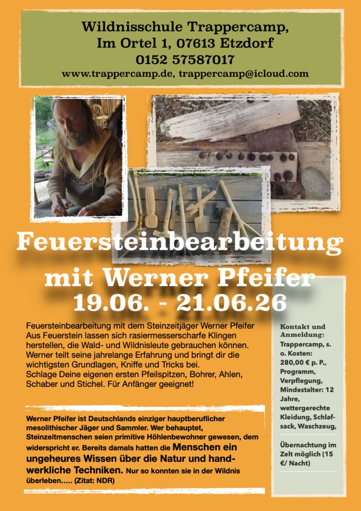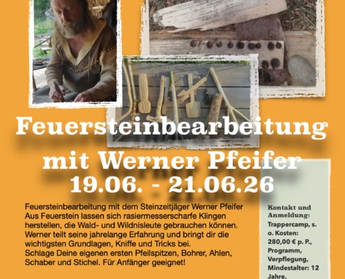 Aus Flint oder auch Feuerstein lassen sich rasiermesserscharfe Klingen herstellen die zu vielerlei weiteren nützlichen Gegenständen für Wald- und Wildnisleute geeignet sind, wie Messer, Pfeil- und Speerspitzen, Ahle, Bohrer, Stichel, Schaber, Beil und Multitool. Werner teilt seine jahrelange Erfahrung und bringt dir die wichtigsten Grundlagen, Kniffe und Tricks bei.
